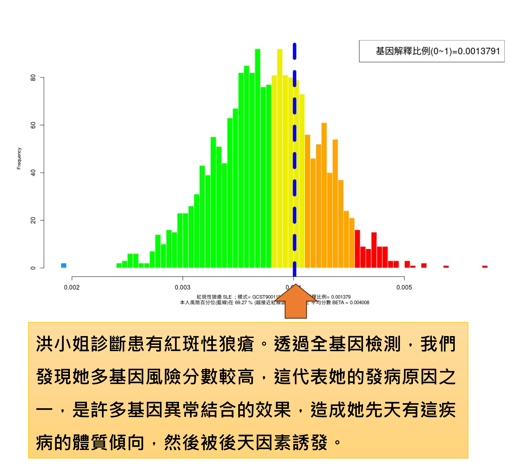 洪小姐在很年輕的時候就被診斷患有紅斑性狼瘡。透過全基因檢測,我們發現她多基因風險分數較高,這代表她的發病原因之一,是許多基因異常結合的效果,造成她先天有這疾病的體質傾向。
