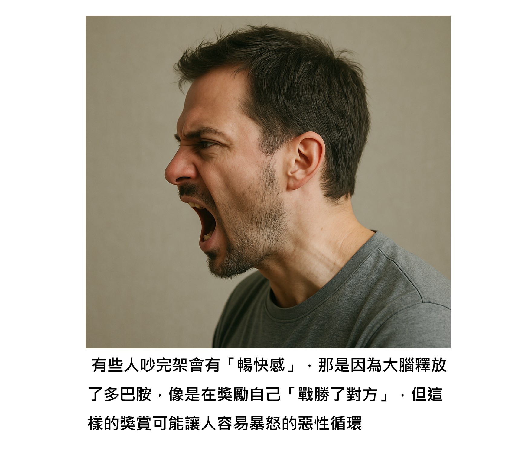 有些人吵完架還會有一種「暢快感」,那不是您怪,是因為大腦在那一瞬間釋放了多巴胺,像是在偷偷獎勵自己「戰勝了對方」,但這樣的獎賞是短暫的,也可能讓人一次次掉入惡性循環。