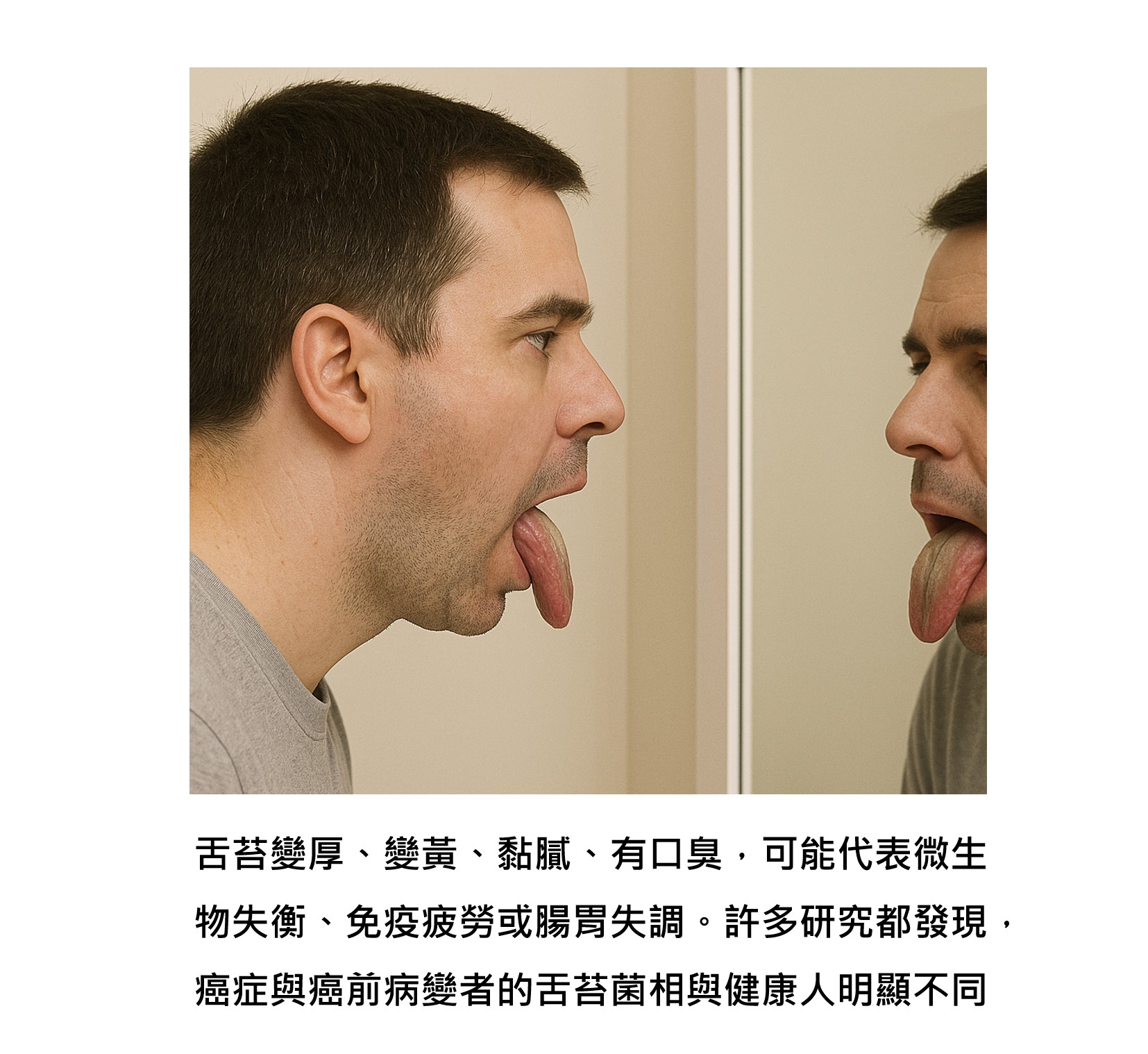 這樣的菌相變化,其實與身體內部的慢性發炎、免疫調節異常與腸胃道的代謝有關,也就是說,當身體開始走向癌變,舌苔早就開始「變色」。這不只是學術上的發現,更是我們每個人都看得到、感受得到的訊號。
