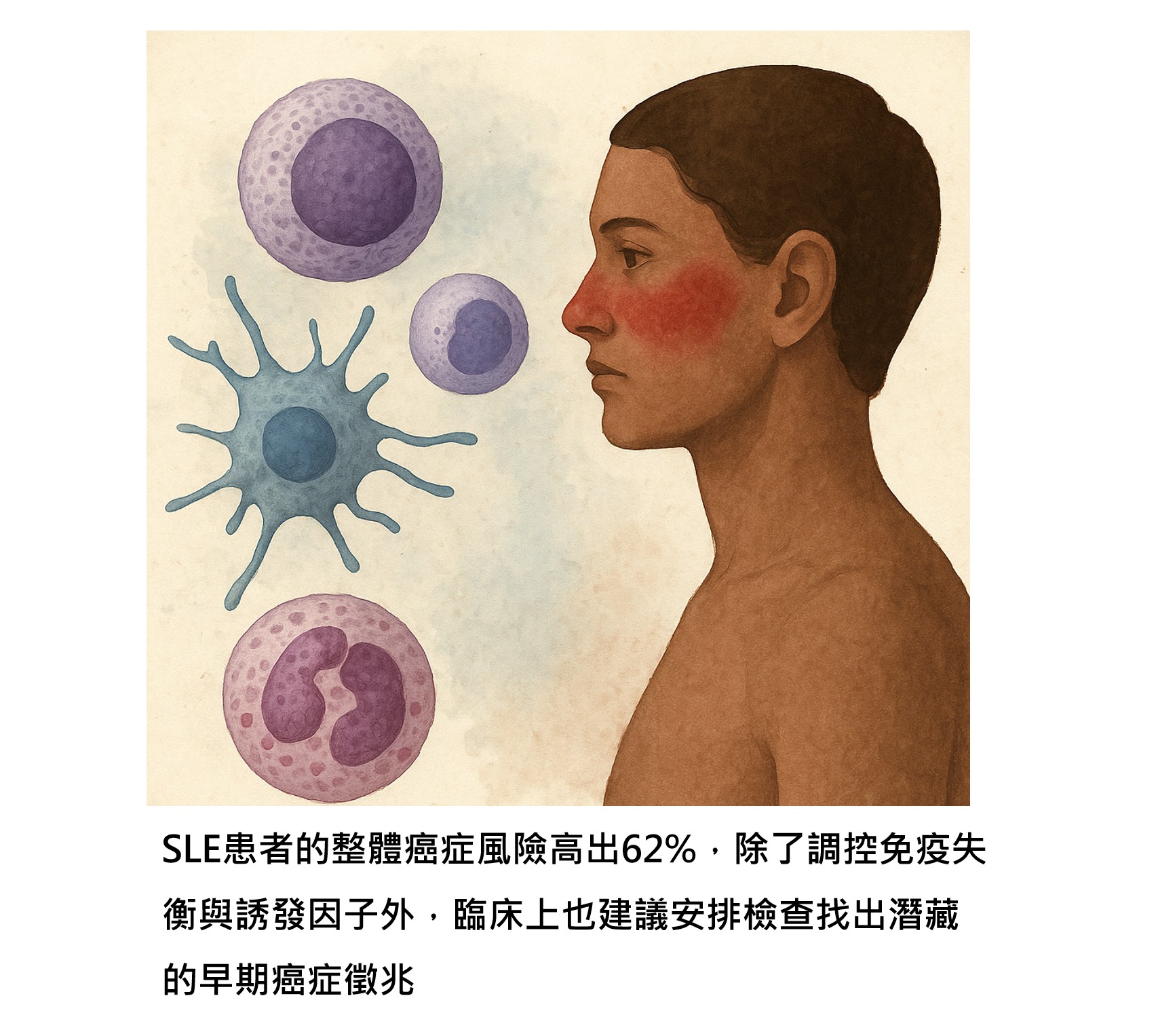 這樣的數據,讓我在面對SLE病友時格外謹慎,每次看診、安排檢查時,我都特別會去留意有無潛藏的癌症徵兆,因為這些風險不是抽象的數字,而是每一位患者真實需要面對與預防的挑戰。