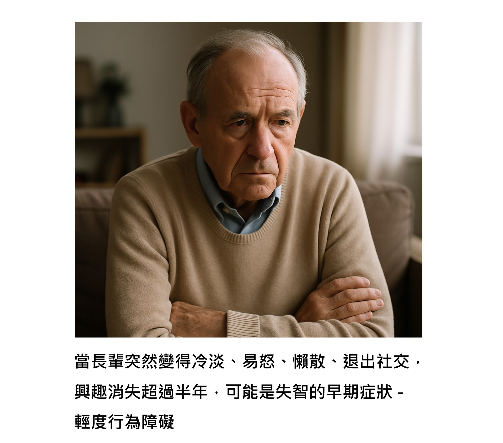 這些改變看起來不像生病,但家人都知道,那不是他平常的樣子。這些現象,常常被說是「退休症候群」、「心情不好」、「老化自然現象」,但我會建議大家多留心,因為這可能是大腦在發出最早的求救訊號:輕度行為障礙(Mild Behavioral Impairment)。