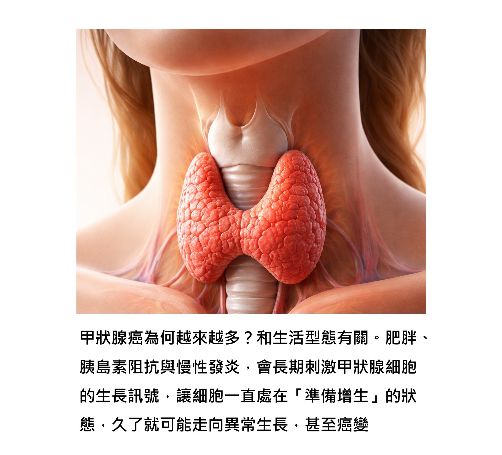 這也是為什麼肥胖、內臟脂肪型體態、胰島素阻抗,會被視為甲狀腺癌的重要上游風險因子。