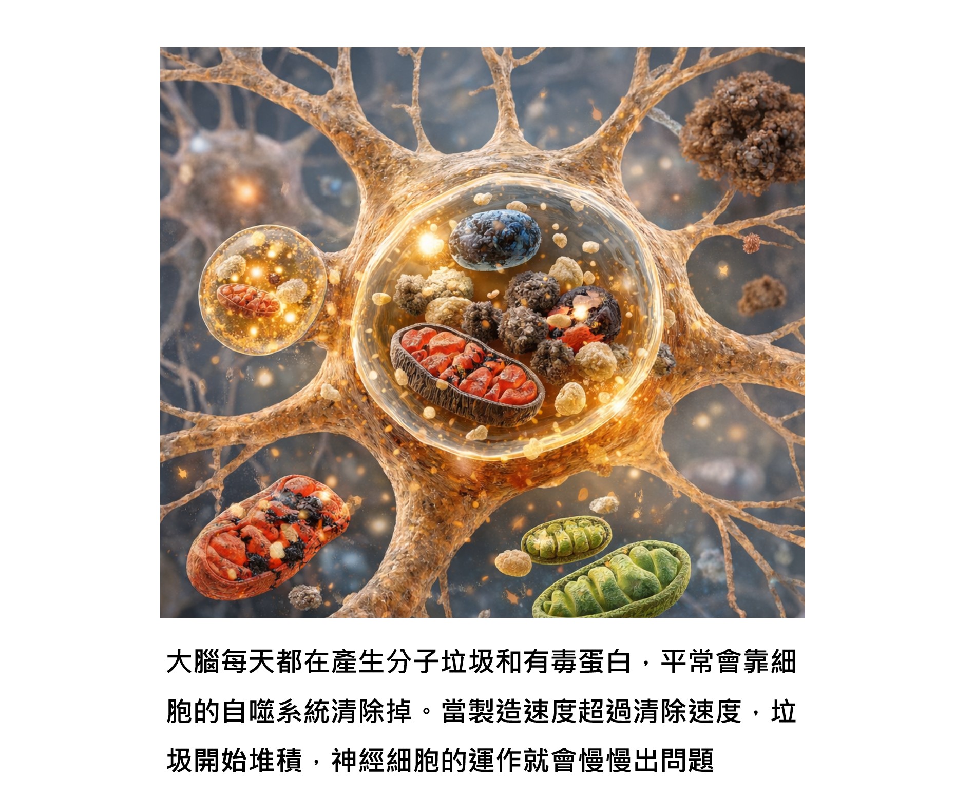 我們的大腦每天都會產生很多「分子垃圾」,像是壞掉的蛋白質、老化的粒線體、錯誤摺疊的分子,這些本來都是正常代謝一定會出現的副產品,只要清得掉,其實不會出問題。