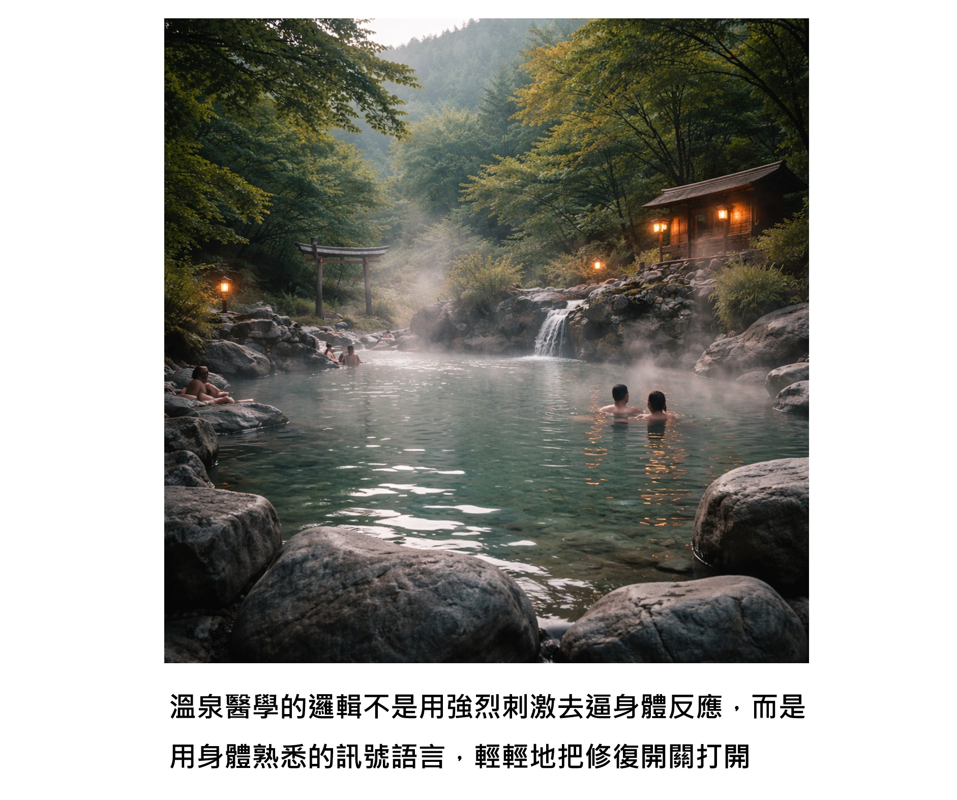 也因此,溫泉醫學 (balneology) 的邏輯就很清楚了。它不是用強烈刺激去逼身體反應,而是用身體熟悉的訊號語言,輕輕地把修復開關打開。