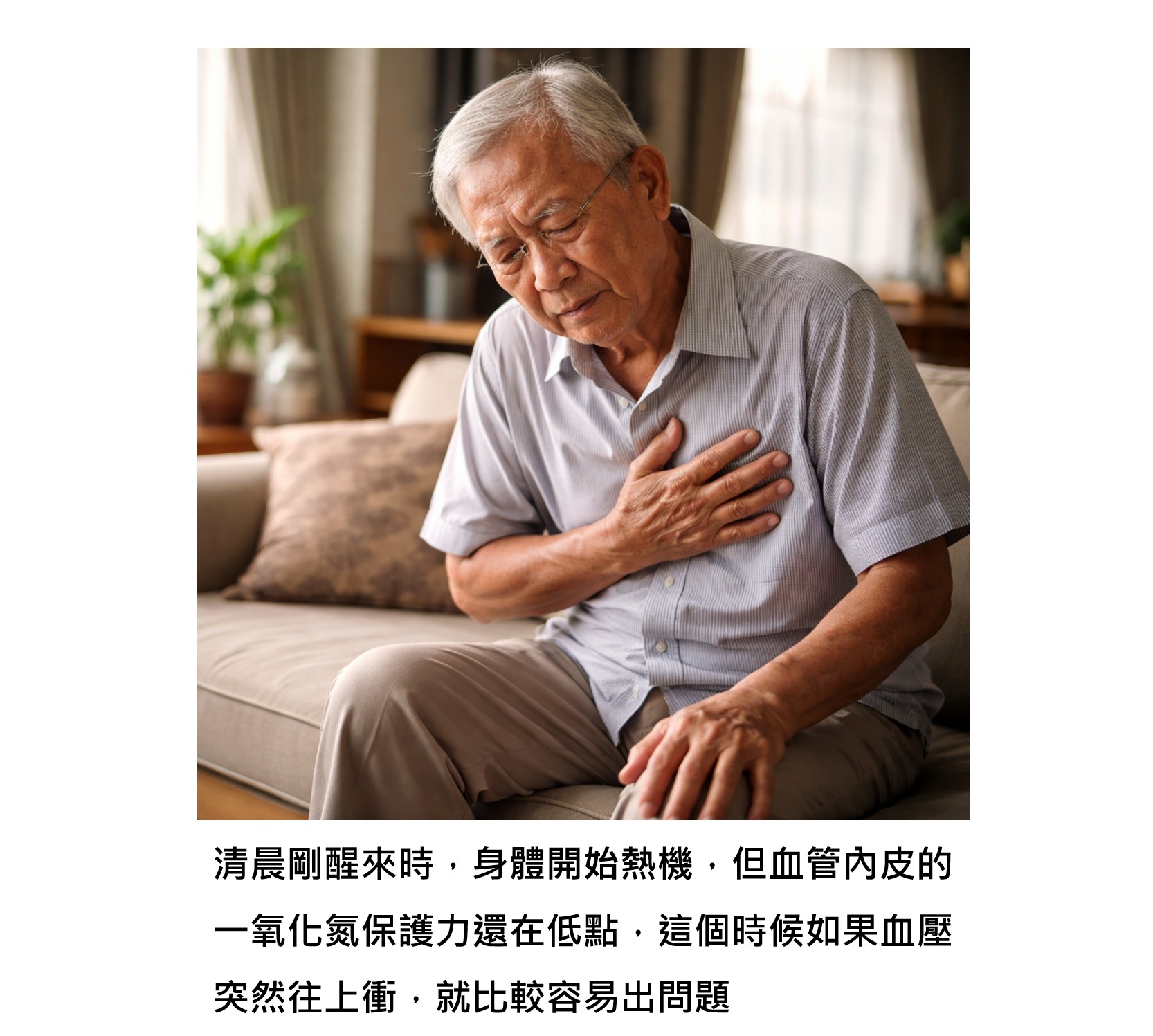 為什麼要這樣?因為清晨一氧化氮本來就偏低,血管比較緊,彈性還沒完全恢復。如果動作太快,血壓瞬間變化大,血管來不及調整,風險自然增加。給身體一點時間,讓它慢慢「開機」,其實就是在幫血管多加一道保護。