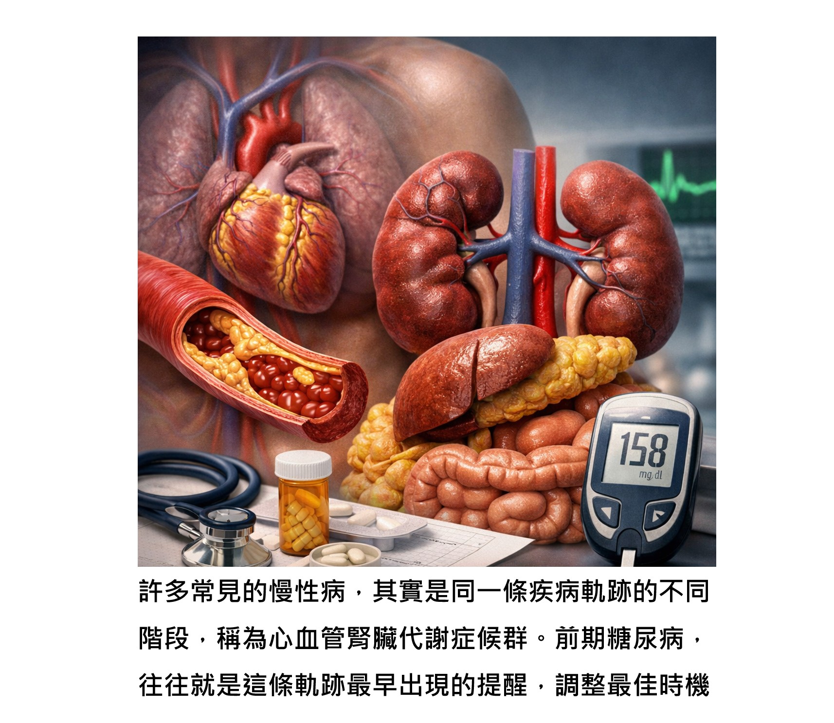 當健檢報告出現前期糖尿病時,其實代表身體正處在心血管腎臟代謝症候群軌跡比較前面的階段,