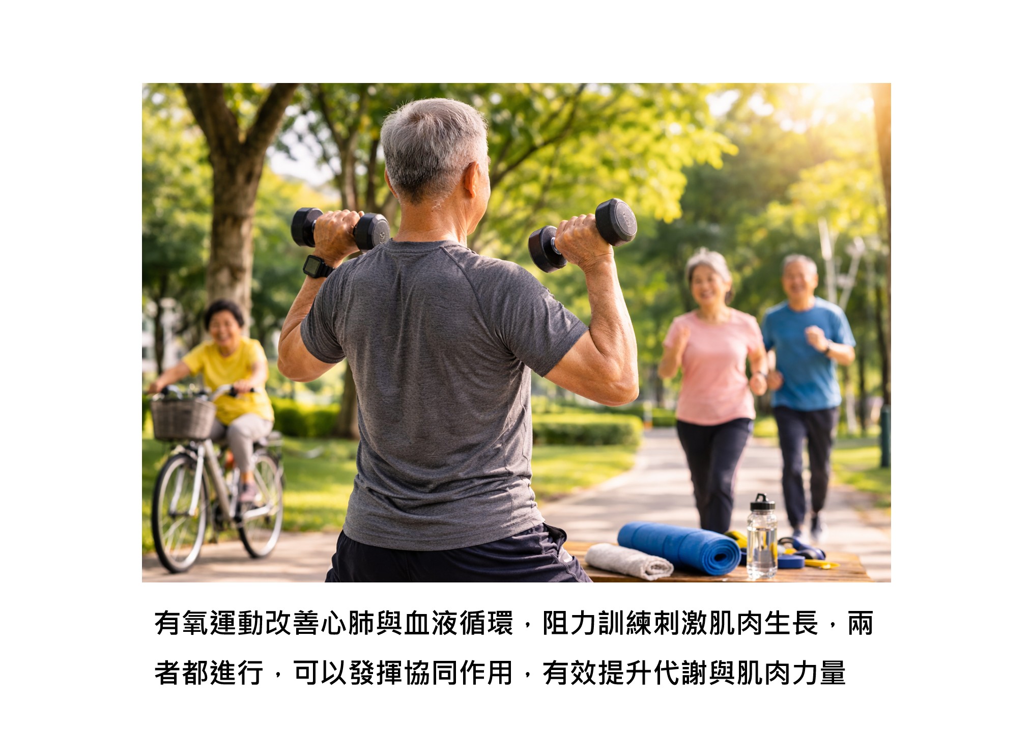 有氧運動先改善血流與代謝環境,而阻力訓練再刺激肌肉生長,兩者互相配合,就能同時提升肌肉量與身體功能。